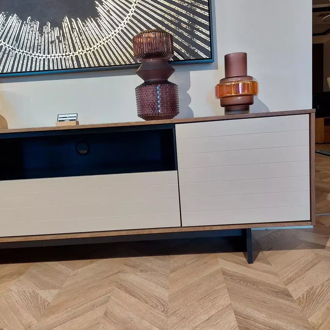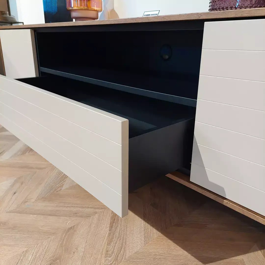 Szafka pod telewizor wyposażona jest w szufladę i dwoje drzwiczek.